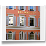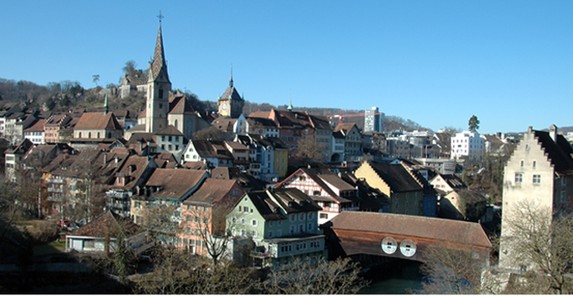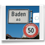 Wappen Baden - ABB - Schmiede (ABB-Areal) - Altstadt-Dächer - Bäderquartier - Bahnhof Baden - Fassade Bruggerstrasse - RVBW Bus - Postauto - Grand Casino Baden - Halde - Holzbrücke - Hochbrücke - neuer Lift Limmatufer - Limmathof - Treppe Martinsberg - Ortstafel Baden - Ruine Stein - Blick auf Stadt Baden - Stadthaus - Stadtturm - Trafo Halle - Wanderweg